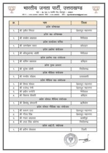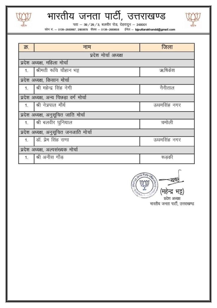 - अनुसूचित जाति मोर्चा – बलवीर घुनियाल