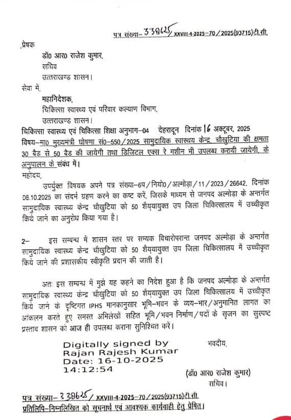 राज्य सरकार द्वारा जारी शासनादेश के बाद यह स्पष्ट हो गया है कि चौखुटिया में अब अधिक बिस्तर, उन्नत चिकित्सा उपकरण और विशेषज्ञ सेवाओं की उपलब्धता सुनिश्चित की जाएगी।