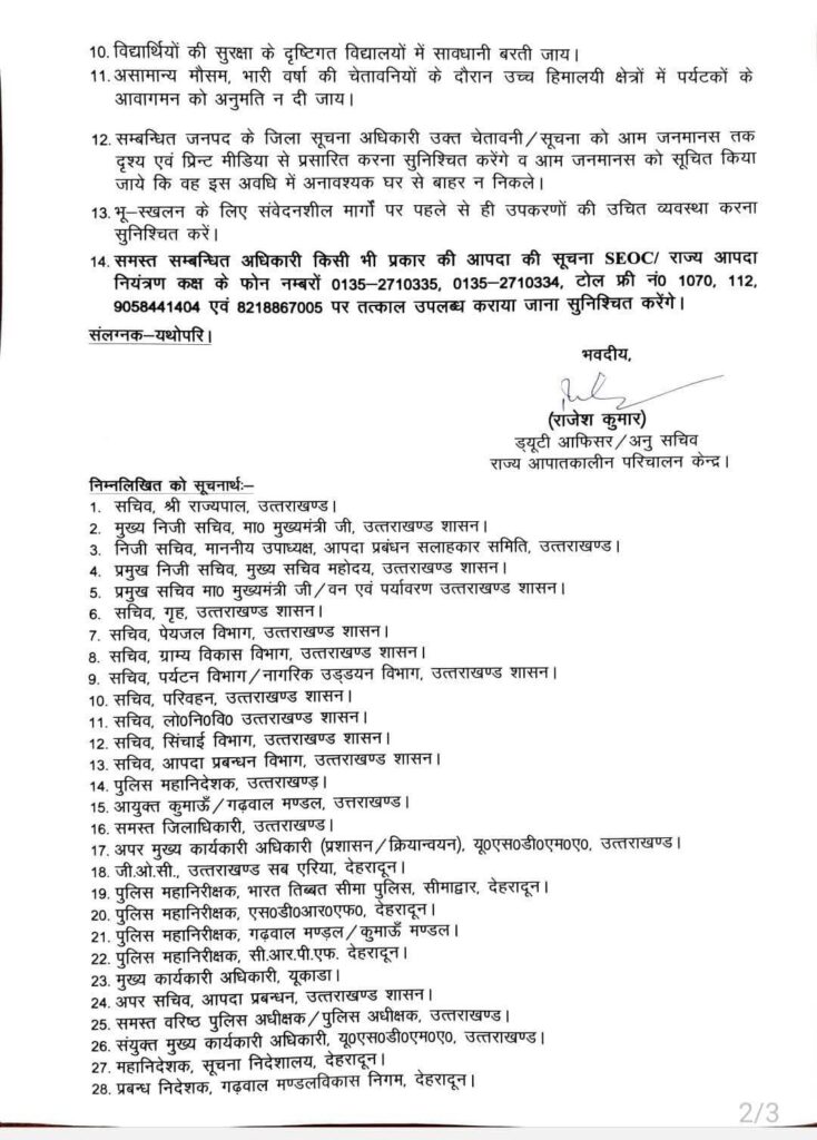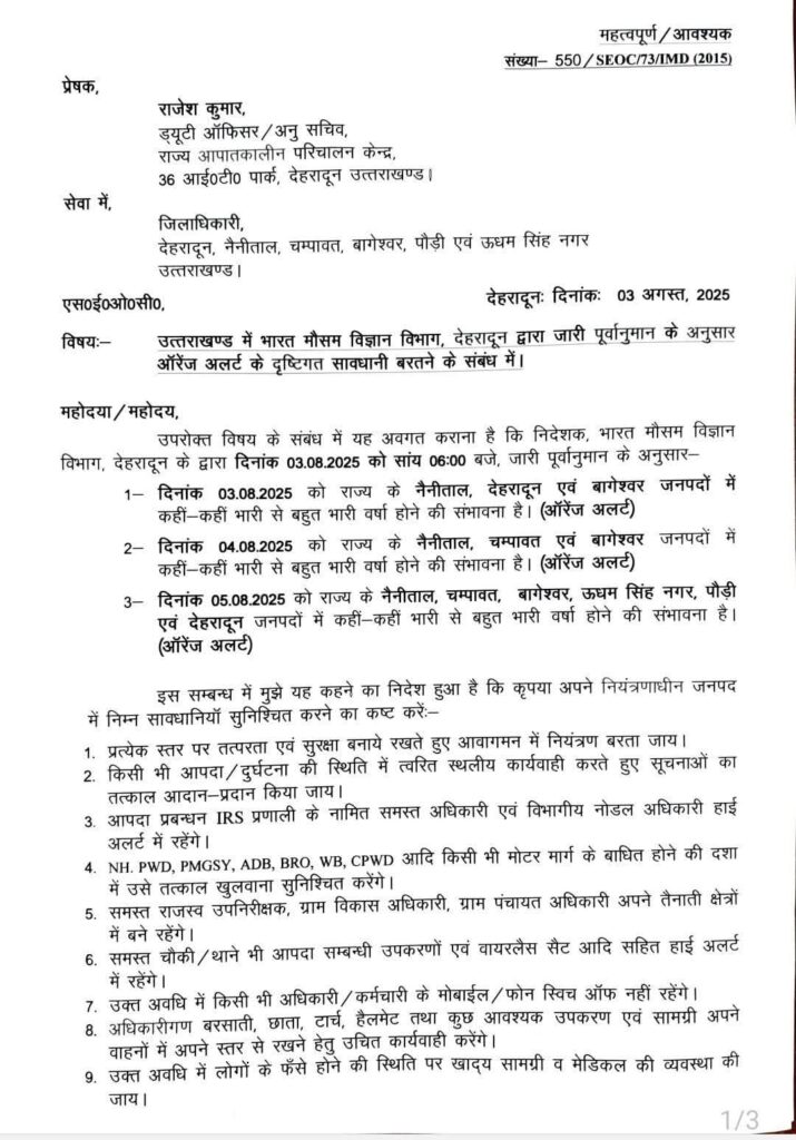 भारत मौसम विज्ञान विभाग ने उत्तराखण्ड के छह जिलों में आगामी 03 अगस्त से तीन दिन तक के लिए ऑरेंज अलर्ट जारी किया है। जिन जिलों में यह चेतावनी दी गई है, उनमें देहरादून, नैनीताल, चम्पावत, बागेश्वर, पौड़ी गढ़वाल और ऊधम सिंह नगर शामिल हैं।